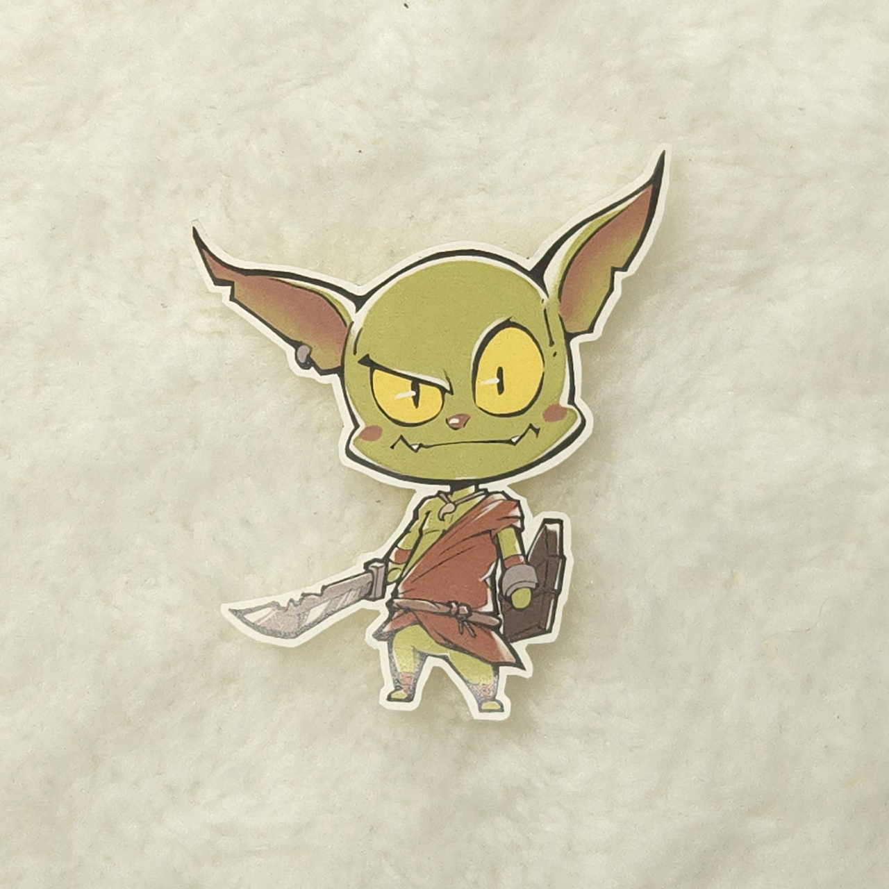 Gobby’s bold grin and make-shift sword capture his fearless attitude in this vibrant sticker. Perfect for sketchbooks, laptops, or anywhere that needs a spark of goblin mischief.