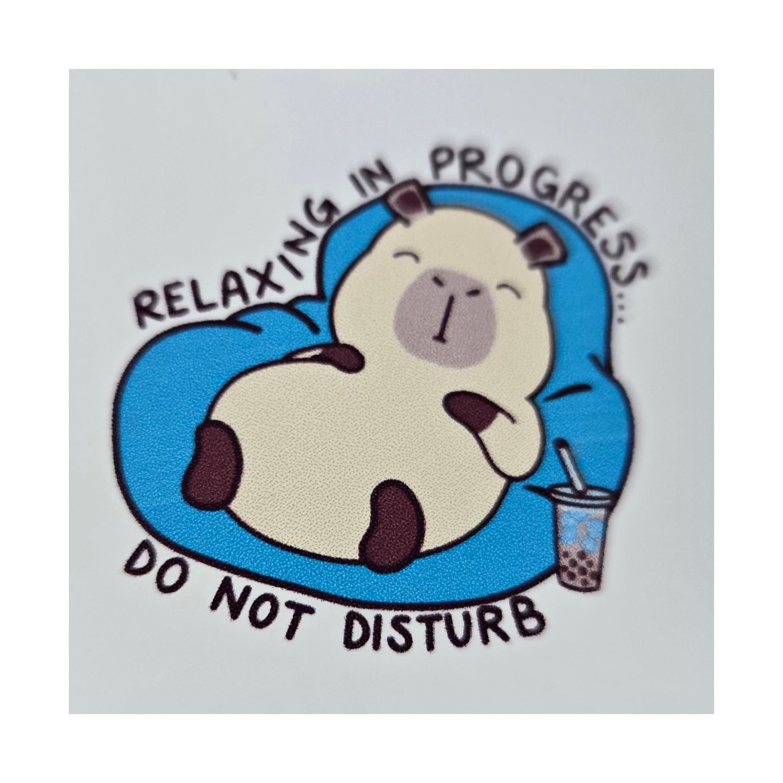 A cute relaxing Coby sticker that signals chill time. Great for personal items.